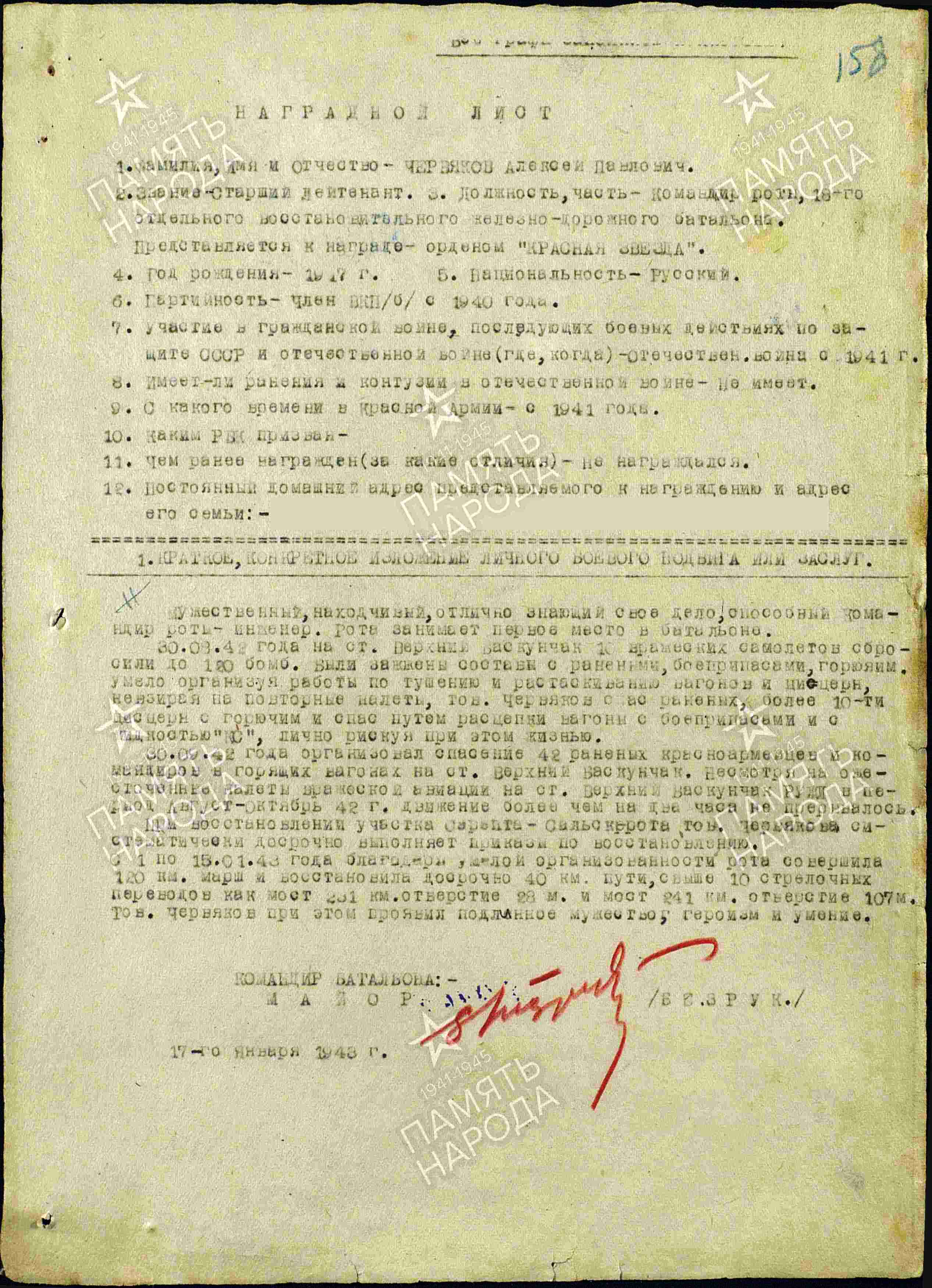 «Однажды ночью в начале осени 1942 г. на станцию В. Баскунчак был произведён массированный налёт фашистских пикирующих бомбардировщиков. Среди обычных бомб была сброшена бомба весом в 1000 кг, которая попала на станционную площадку, заполненную эвакуированными и вагонами с взрывчаткой. Имелись очень большие человеческие жертвы. Воронка от бомбы образовалась огромная, засыпать её было невозможно, станционная площадка была завалена выброшенным грунтом, обломками подвижного состава. Я в это время ехал на легковой машине в Палласовку, слышу очень сильный взрыв, грохот и гул. По дороге нас остановили несколько пострадавших от ожогов человек, рассказали обо всем, просили прислать машины для раненых. Двух я посадил с собой, подъехали к разбитым эшелонам, там уже работали воины 18-го овждб с командиром батальона капитаном Безруком С.Ф. В сложных условиях они спасали людей и уцелевшие вагоны, восстанавливали станционные пути. Здесь же работали и роты 100-го восстановительного ж.д. батальона во главе с начальником штаба батальона майором Коробовым и капитаном Червяковым. Медслужбы 18 и 100-го овждб оказывали первую помощь раненым, а тяжело пострадавших отправляли в ближайший госпиталь. Машин не хватало, я сразу выехал на станцию Джанибек и оттуда из подразделений 18-го батальона механизации были высланы автомашины для перевозки раненых. Постарались быстро восстановить разрушенные пути, но остро не хватало материалов – шпал, переводных брусьев, засыпать огромную воронку быстро не представлялось возможным. Но движение по разрушенной станции было восстановлено».