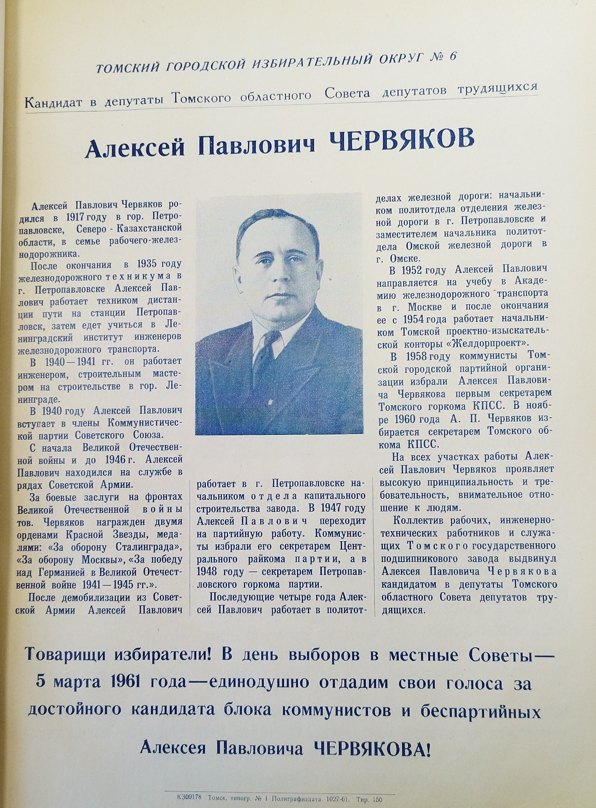 Карьеру депутата Томского облсовета седьмого созыва Алексея Павловича Червякова нельзя назвать ординарной. В его послужном списке – работа инженером, служба в железнодорожных войсках, высокие партийные должности. А завершил он свой трудовой путь в одном из академических институтов Уральского отделения Академии наук СССР.
