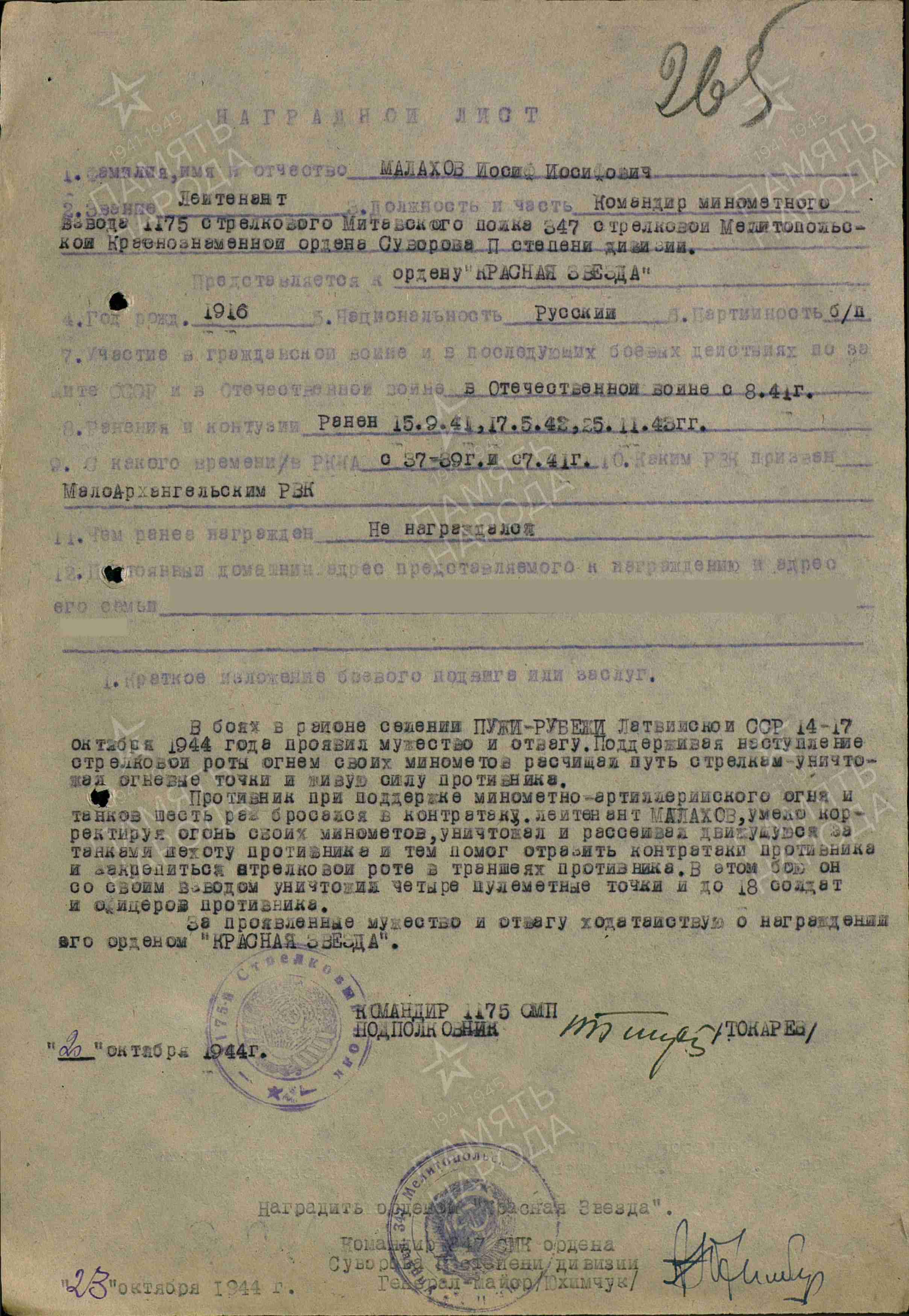 Наградной лист на И.И. Малахова, 1944. Источник: портал «Память народа»