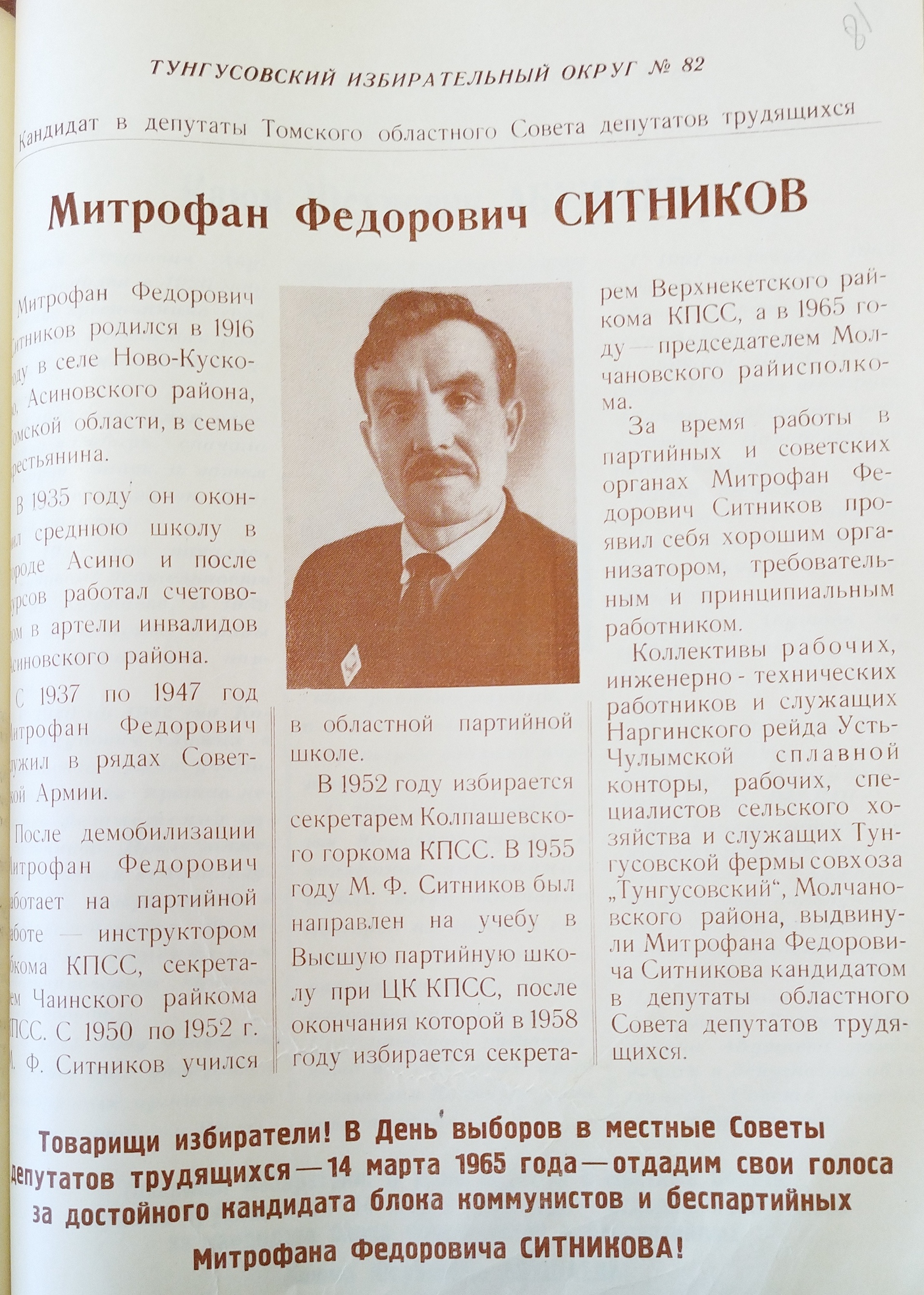 Депутат Митрофан Федорович Ситников принадлежал к кругу руководителей районного звена. По заведенному в 50-е и 60-е годы порядку секретари райкомов и председатели райисполкомов подолгу не работали на одной территории, их перебрасывали из района в район, кого-то на «усиление», кого-то в наказание за просчеты в работе. Вот и председатель Молчановского райисполкома Митрофан Ситников до момента своего избрания в областной Совет успел потрудиться в пяти районах Томской области.