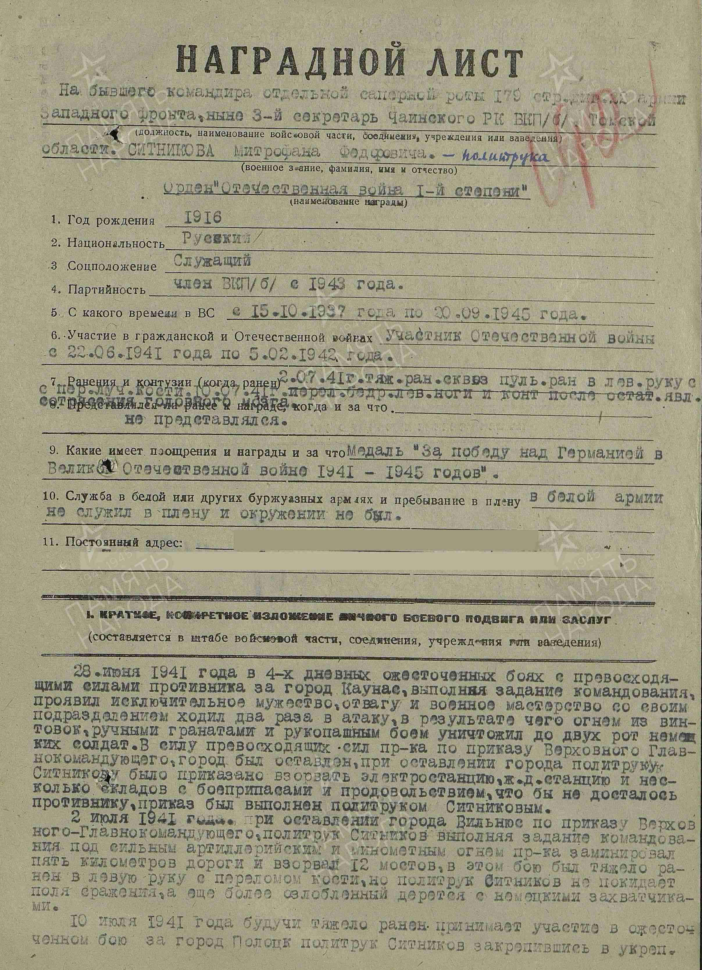 Наградной лист на М.Ф. Ситникова. Источник: портал «Память народа»