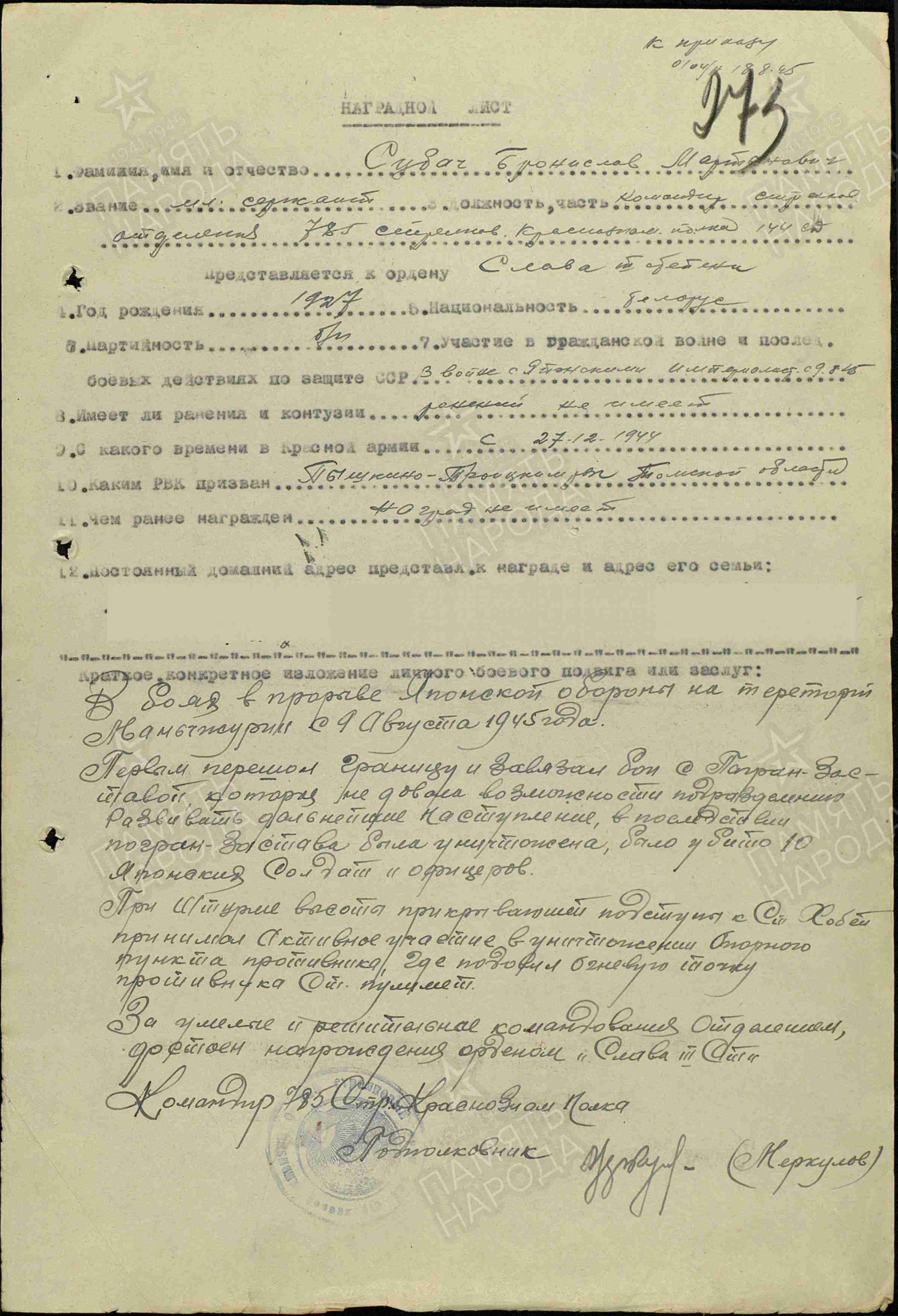 Наградной лист на Бронислава Субача. Источник: портал «Память народа»