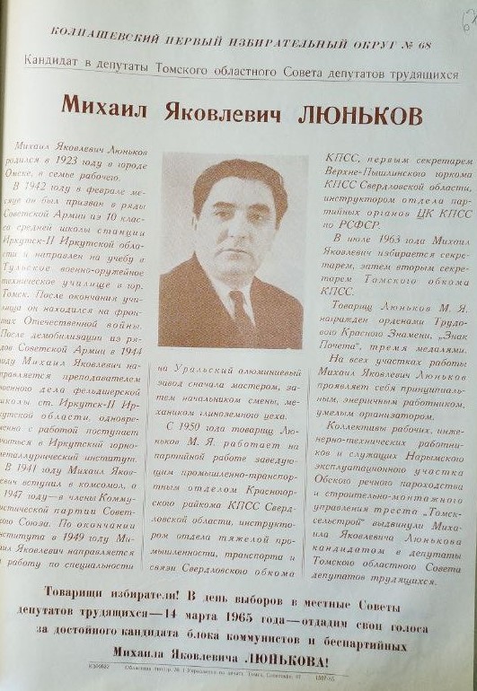 Предвыборная листовка М.Я. Люнькова.Источник: Государственный архив Томской области