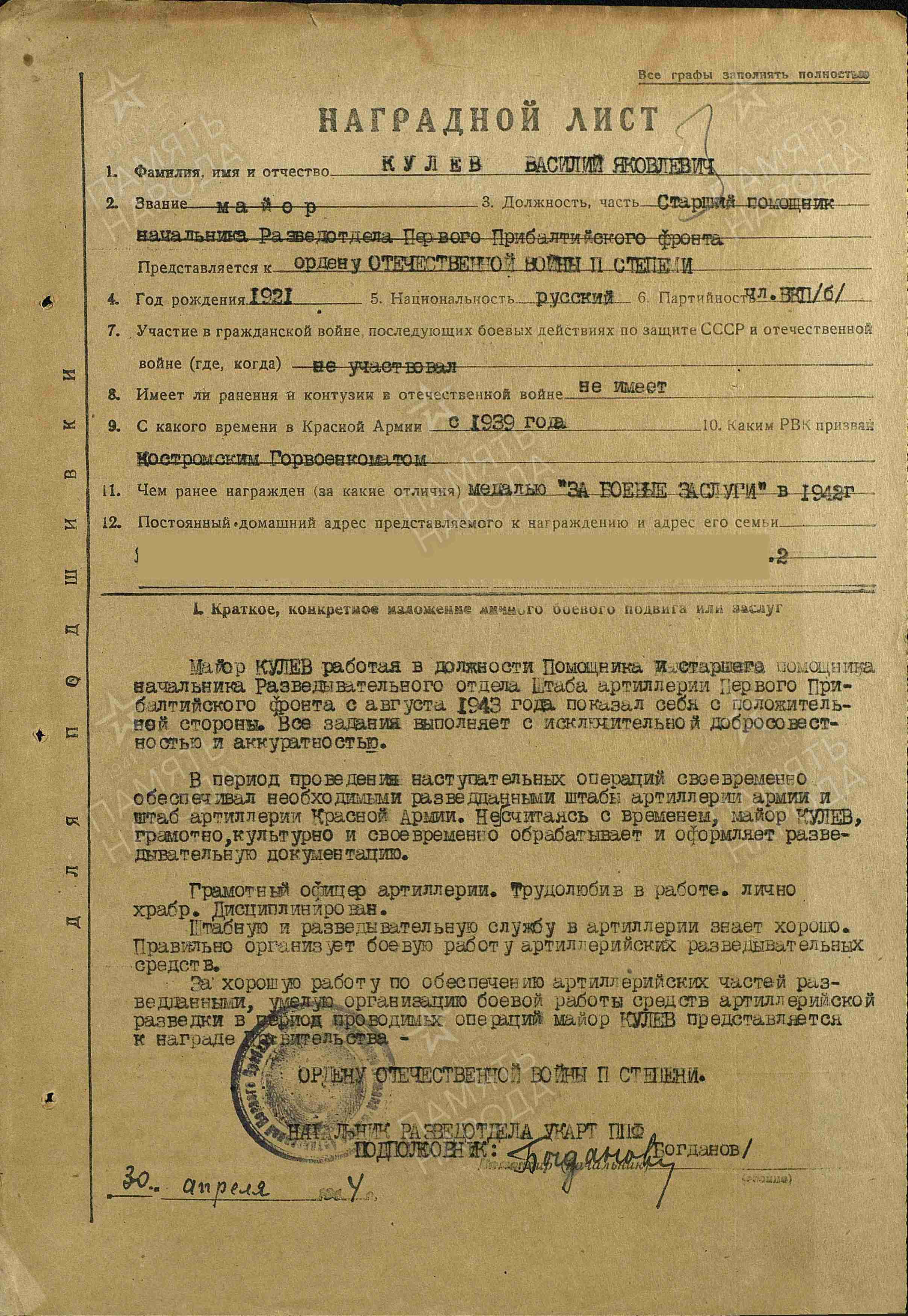Наградной лист на В.Я. Кулёва. Источник: портал «Память народа»