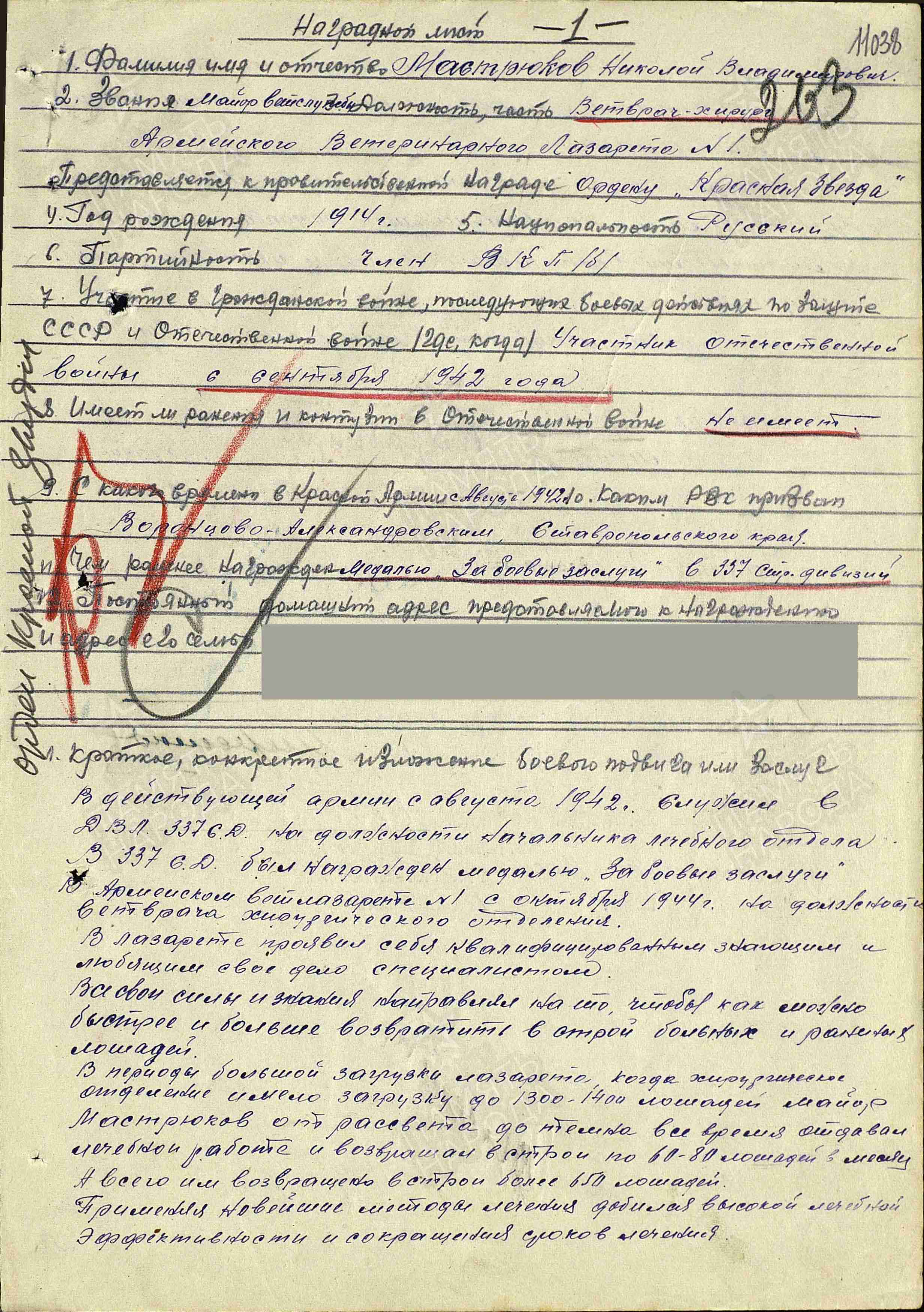 Наградной лист на Н.В. Мастрюкова. Источник: портал «Память народа»