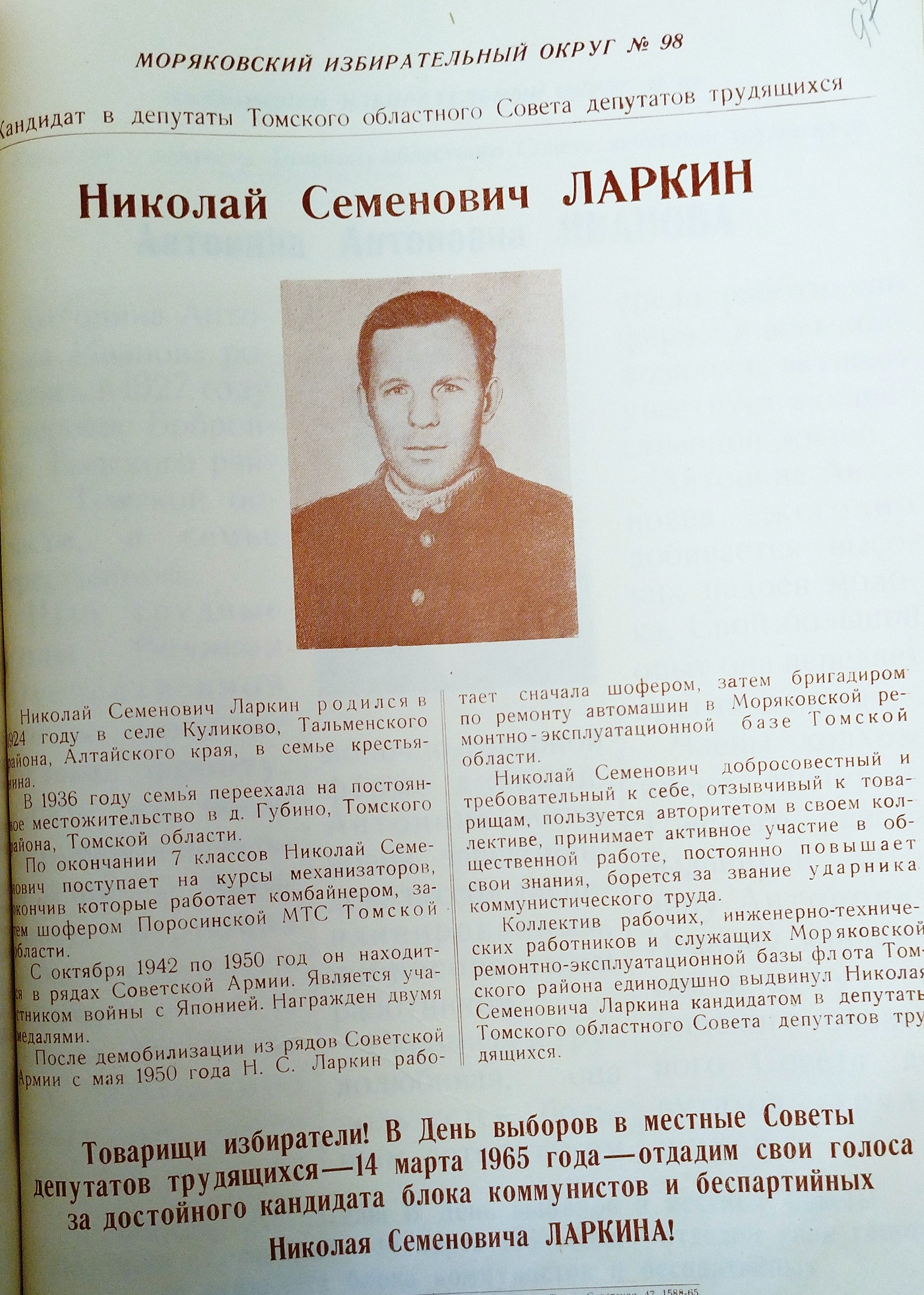 О Николае Семеновиче Ларкине, беспартийном депутате от Моряковской РЭБ флота, к сожалению, известно очень мало.