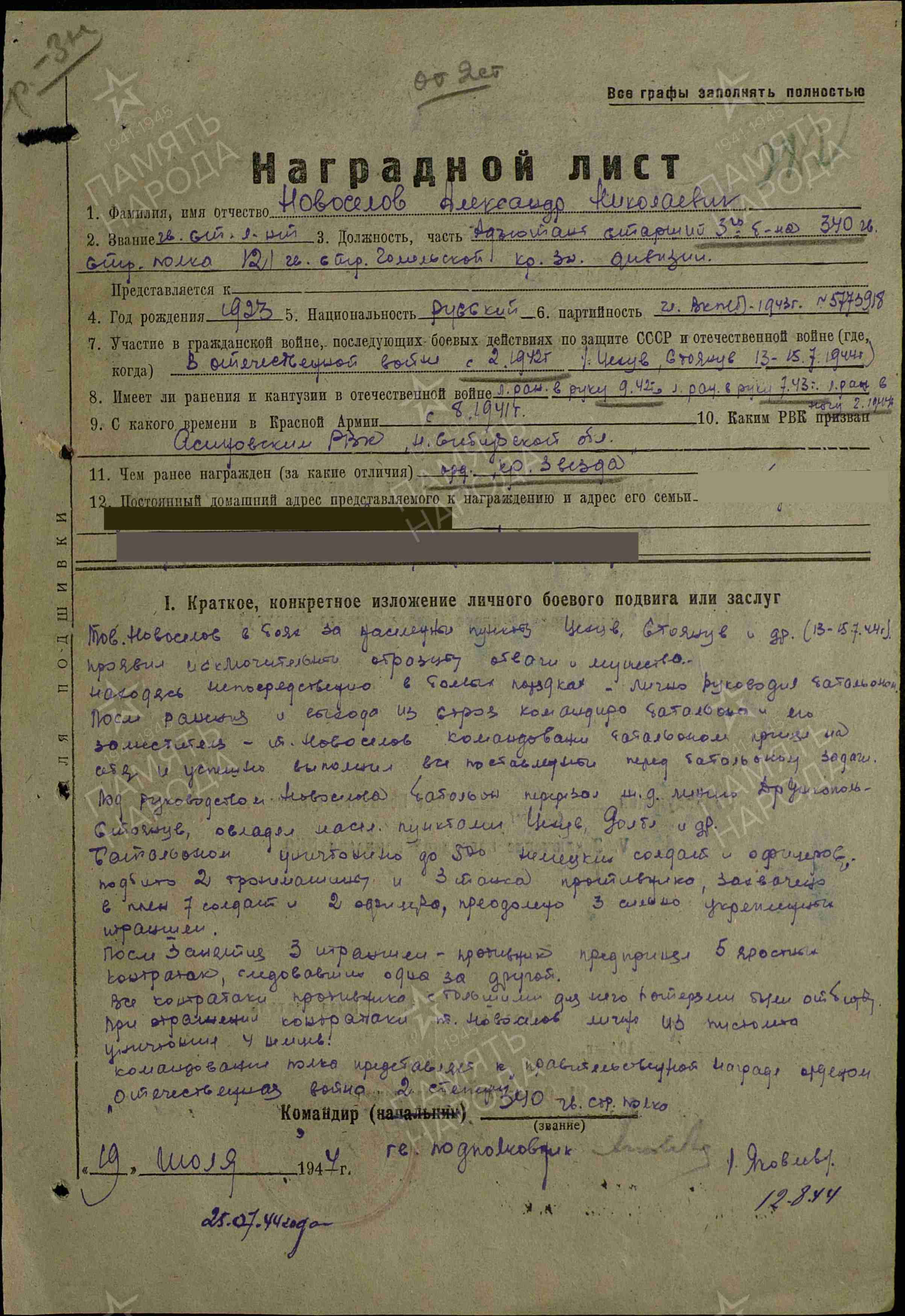 Наградной лист на А.Н. Новоселова. Источник: портал «Память народа»