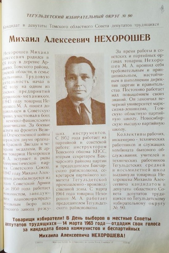 Еще одним представителем плеяды руководителей районного звена Томской области в составе облсовета являлся Михаил Алексеевич Нехорошев, председатель Тегульдетского райисполкома.