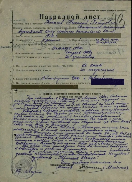 Наградной лист на Н.П. Косачёва. Источник: портал «Память народа»