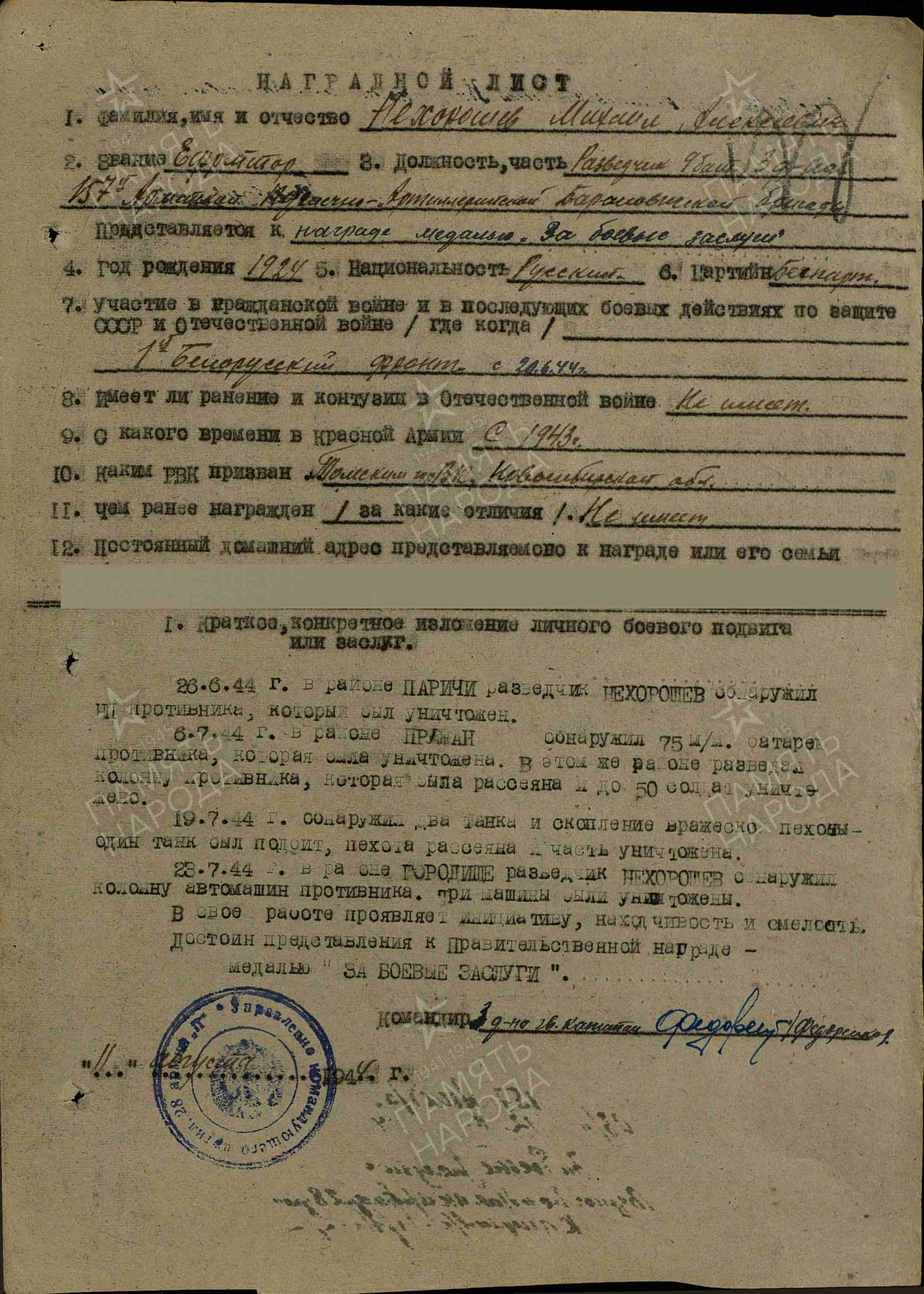 Наградной лист на М.А. Нехорошева. Источник: портал «Память народа»