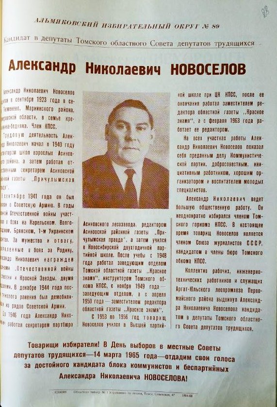 В рамках проекта «Депутаты-фронтовики» мы уже рассказывали о редакторе областной газеты «Красное знамя» послевоенного периода, депутате областного Совета Владимире Кузьмичеве, участнике Великой Отечественной войны. В 1963 году его на редакторском посту сменил другой журналист-фронтовик – Александр Николаевич Новоселов. В 1965 году Александр Николаевич так же, как в свое время его предшественник, был избран областным депутатом.
