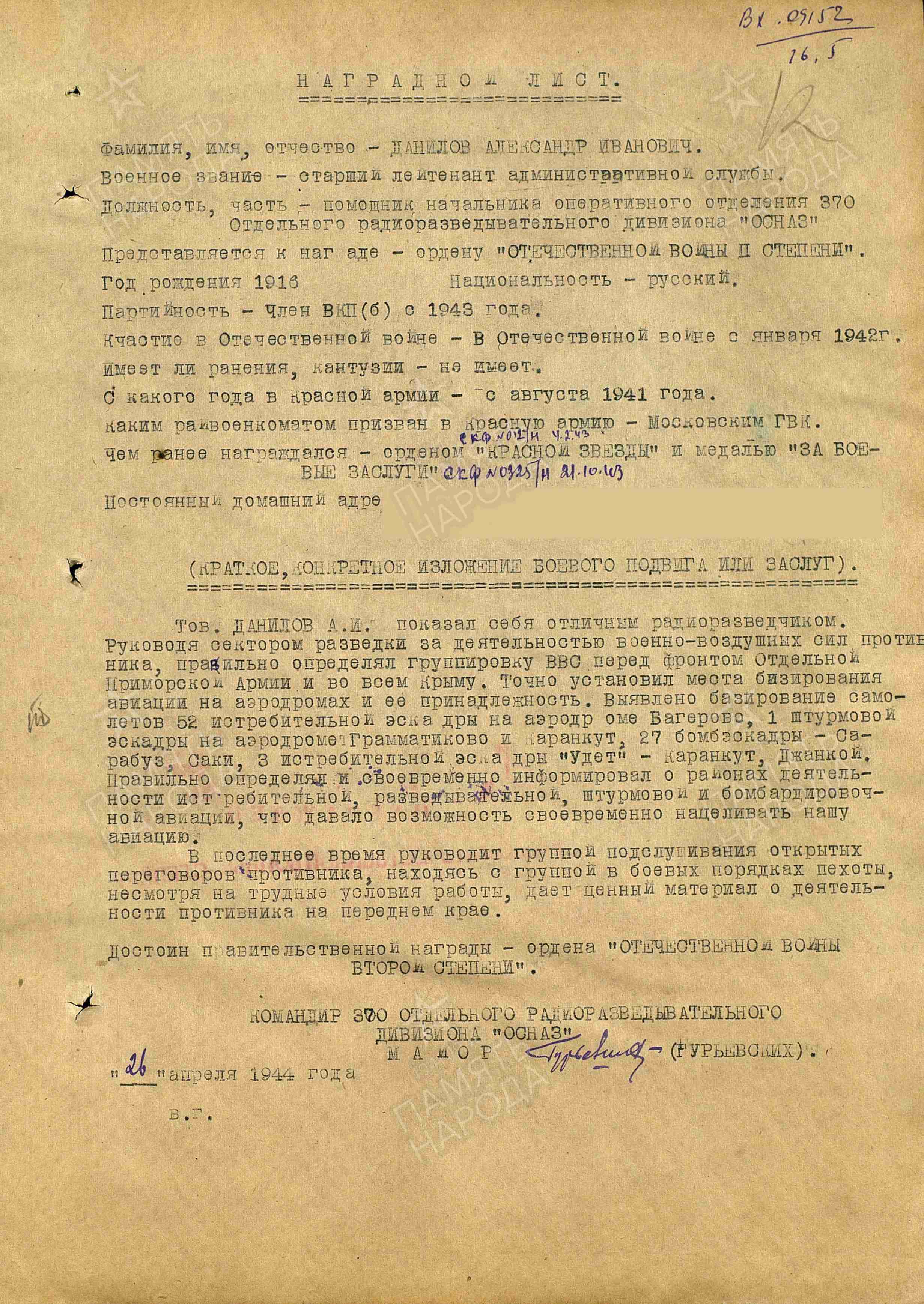 Из другого наградного листа, 1944 года: «Тов. Данилов А.И. показал себя отличным радиоразведчиком. Руководя сектором разведки за деятельностью военно-воздушных сил проитвника, правильно определял группировку ВВС перед фронтом Отдельной Приморской армии и во всем Крыму… В последнее время руководит группой подслушивания открытых переговоров противника, находясь с группой в боевых порядках пехоты. Несмотря на трудные условия работы, дает ценные материалы о деятельности противника на переднем крае».