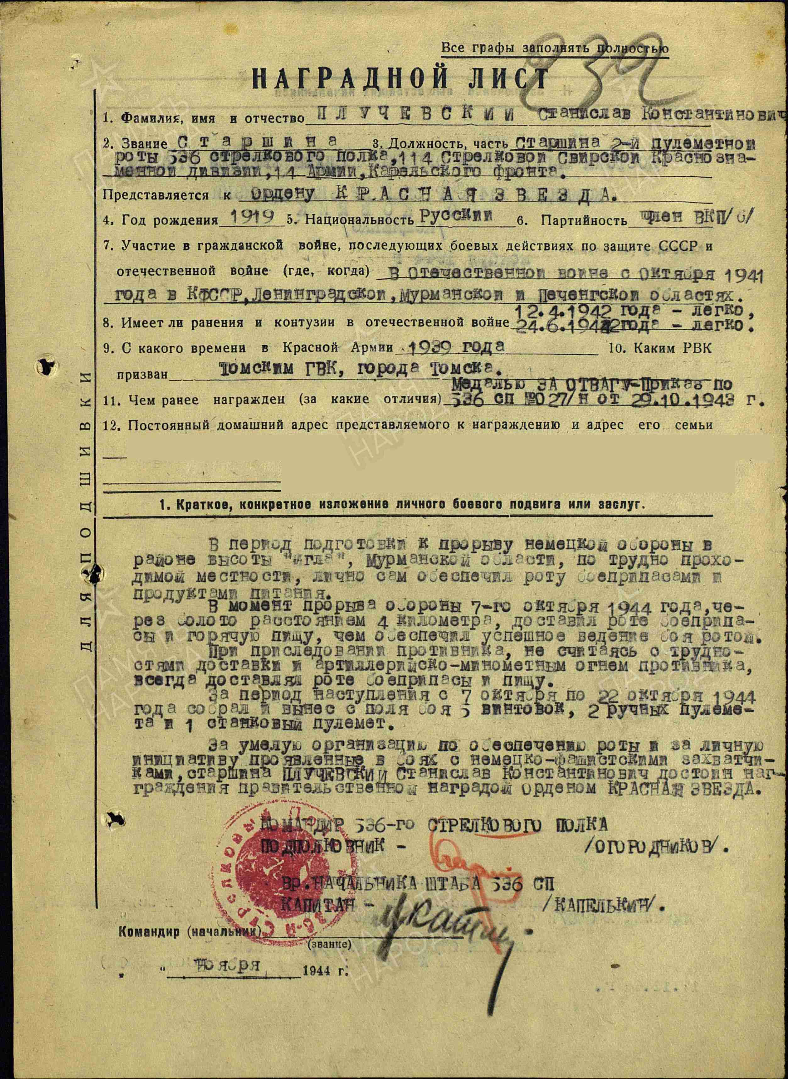 Наградной лист на С.К. Плучевского. Источник: портал «Память народа»
