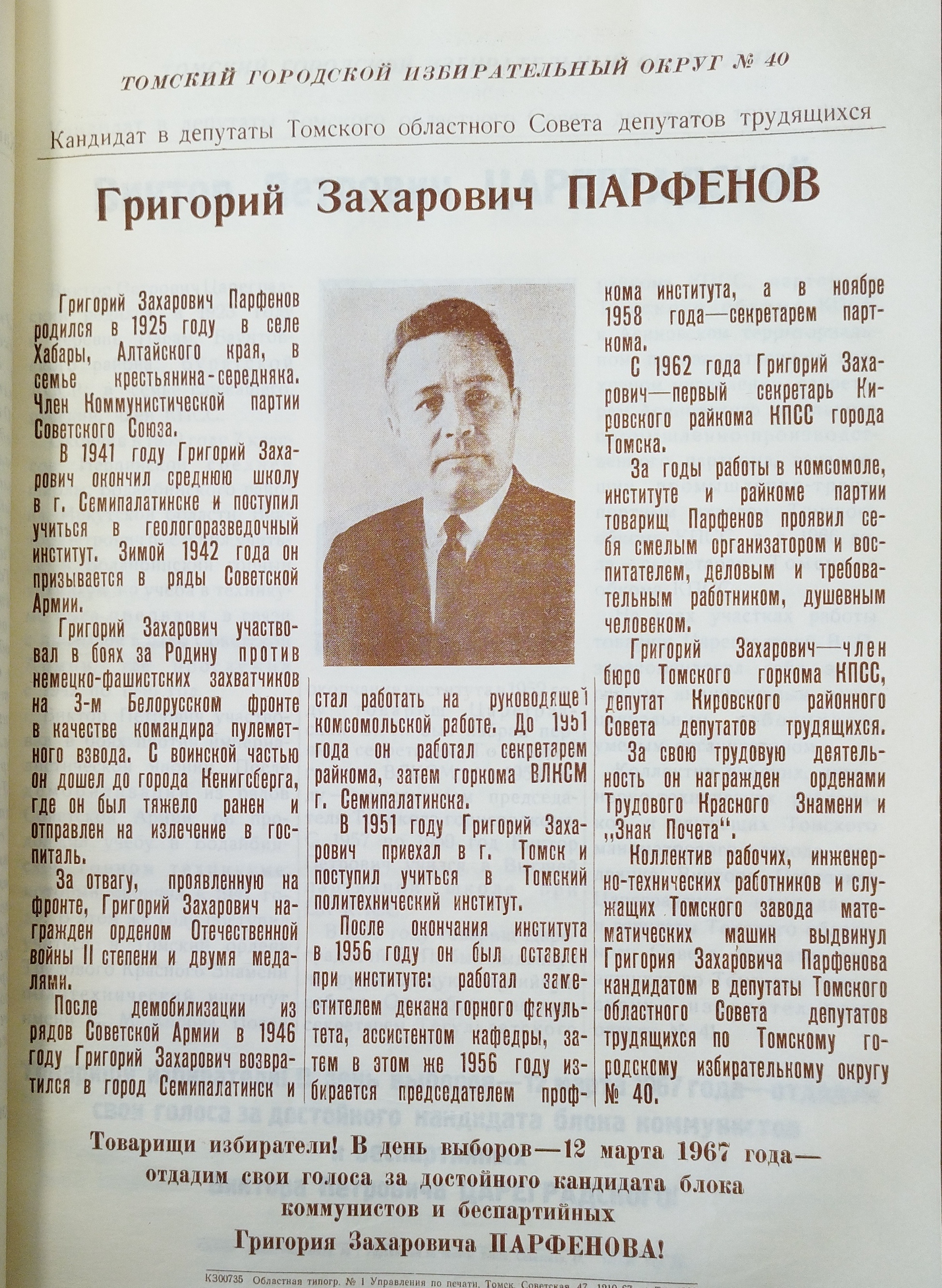 Предвыборная листовка Г.З. Прафенова. Источник: Государственный архив Томской области