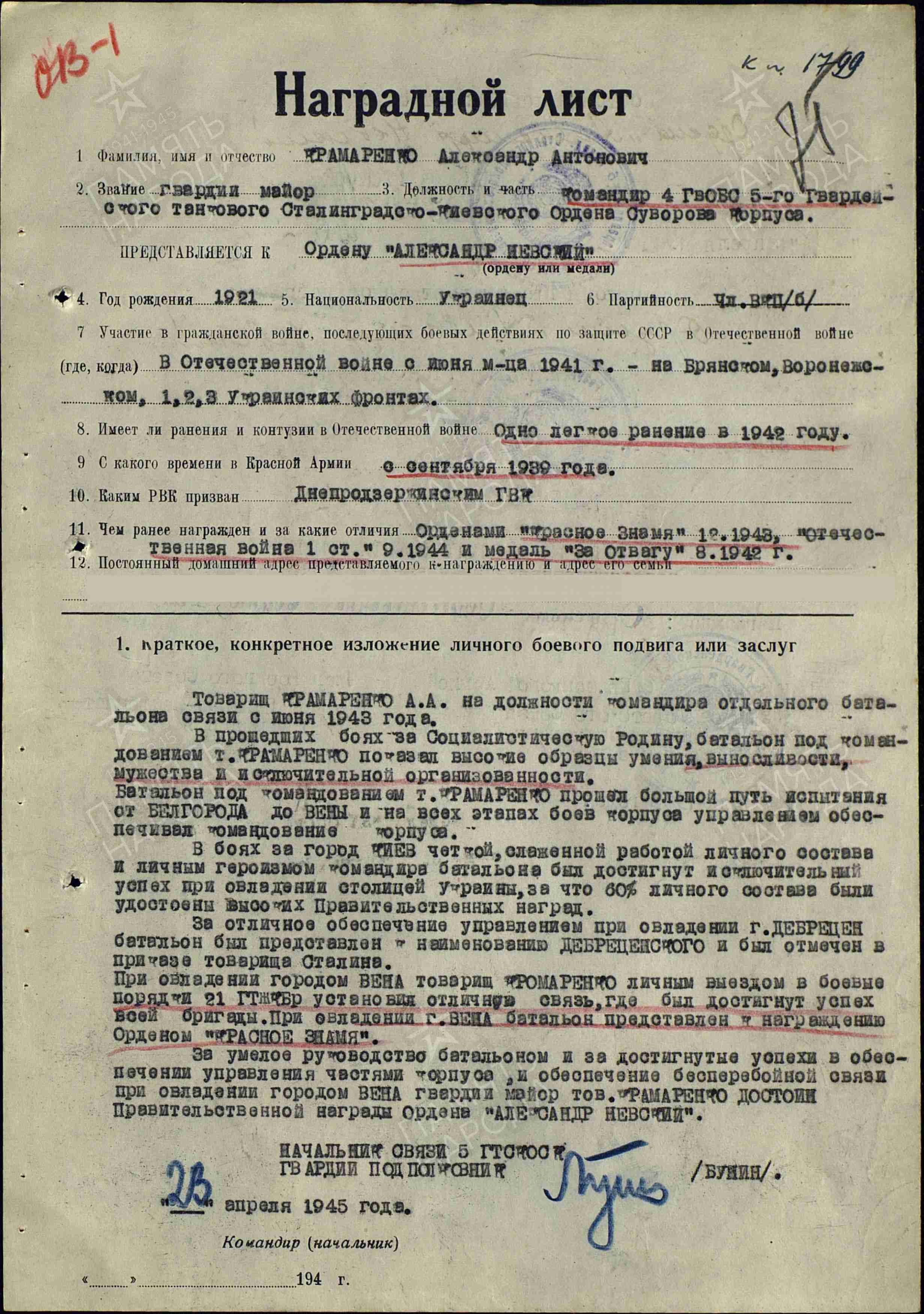 Представление к награждению Александра Крамаренко орденом Александра Невского. Источник: портал «Память народа»