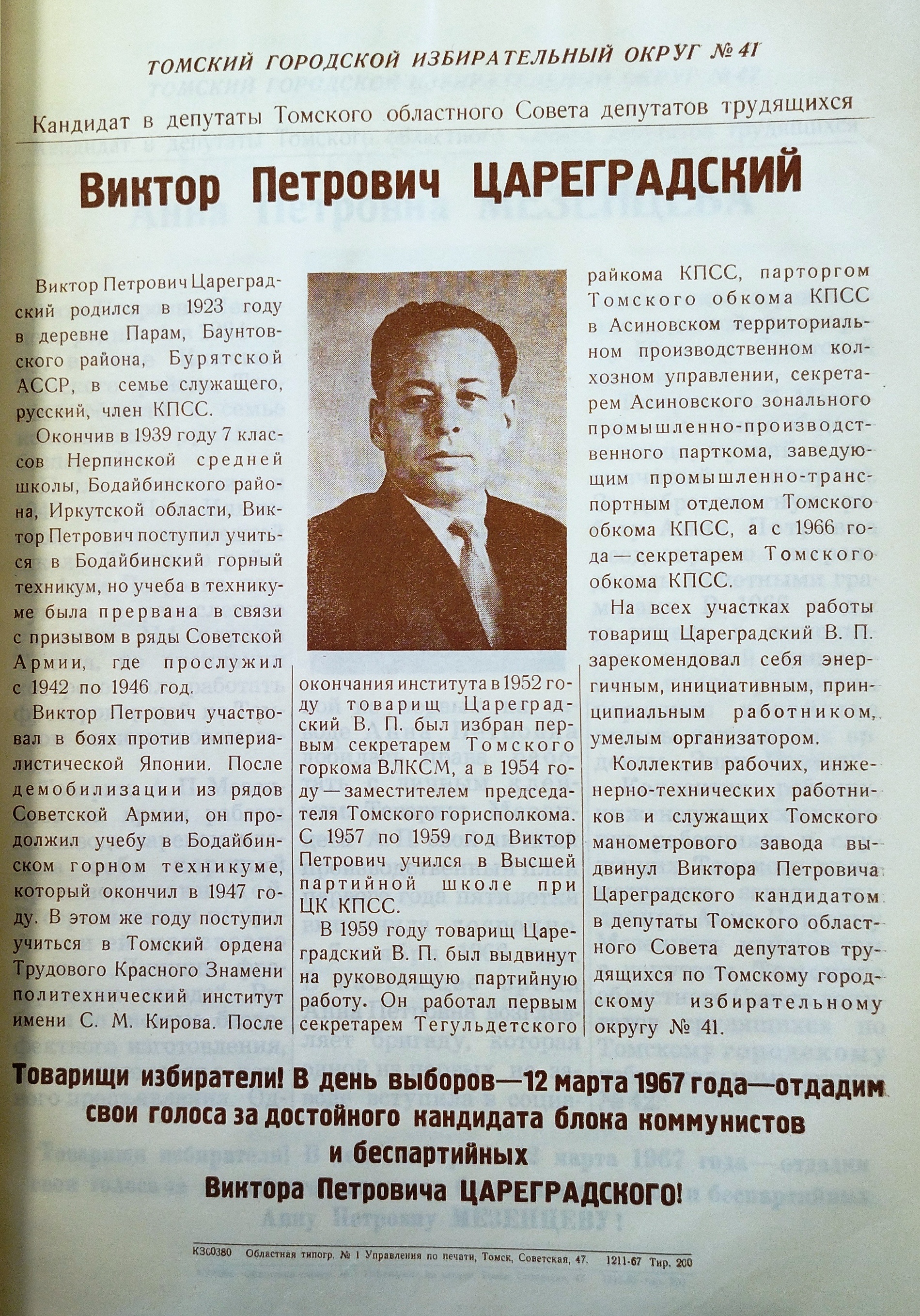 Предвыборная листовка Виктора Цареградского. Источник: Государственный архив Томской области