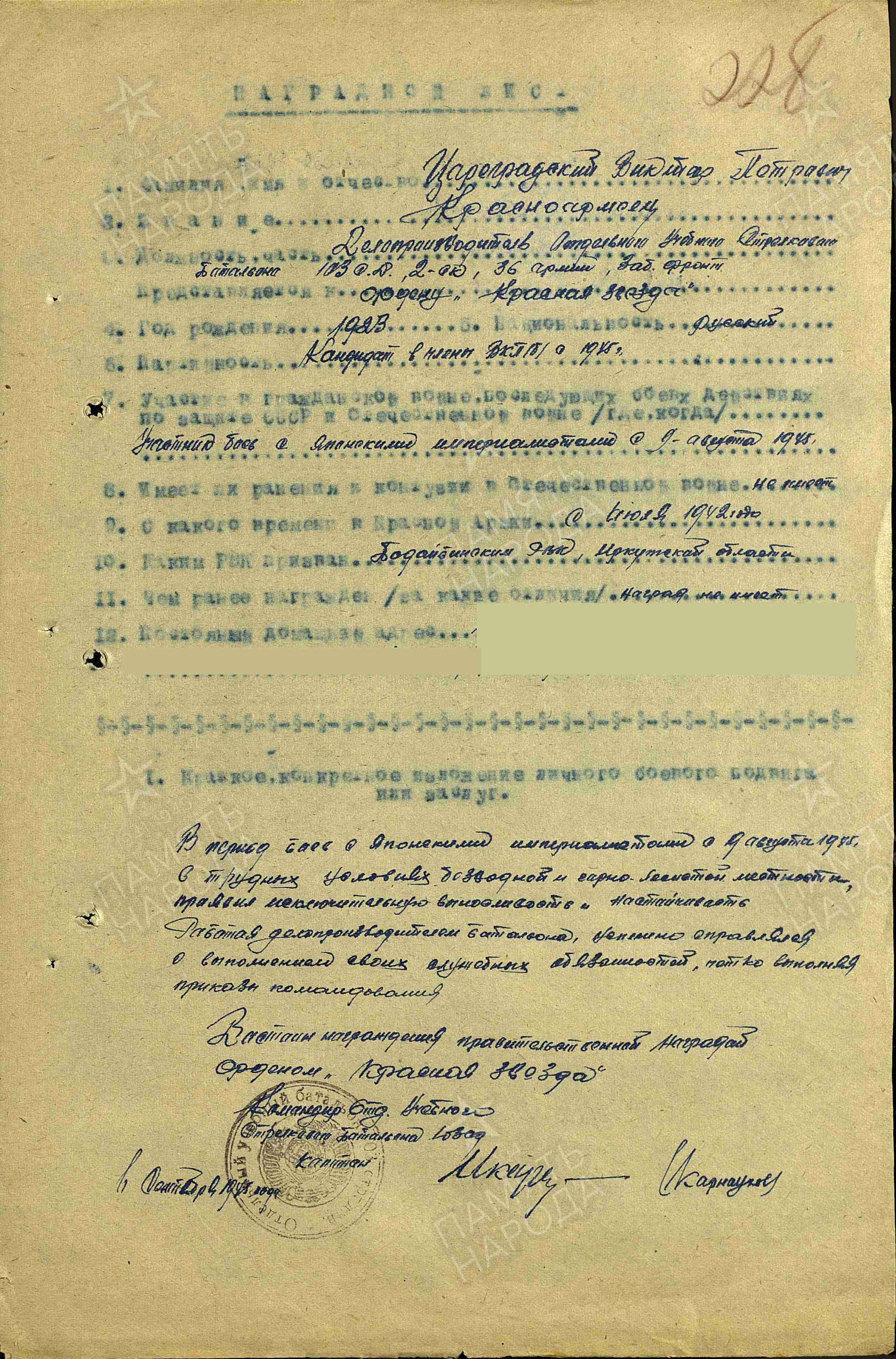 Представление к награждению Виктора Цареградского орденом Красной Звезды. Источник: портал «Память народа»