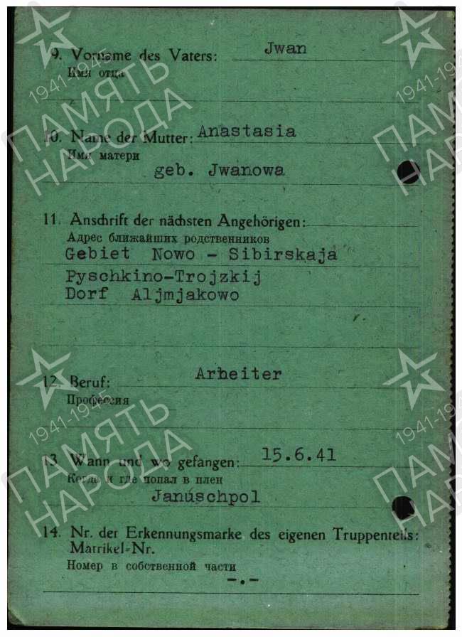 Там же, на портале, даны сканы немецких карточек, которые с педантичностью заполнялись на каждого военнопленного. Вот карточка на Виктора Румянцева: Rumjanzev Wiktor. Gebiet (область) – Leningrad. Bezirk (район) – Ostrowskij. Dorf (деревня)– Juschkowa. Указаны имена отца и матери, и даже адрес ближайших родственников с трудновыговариваемыми для немцев названиями: Pyschkino-Trojzkij, Aljmjakowo.