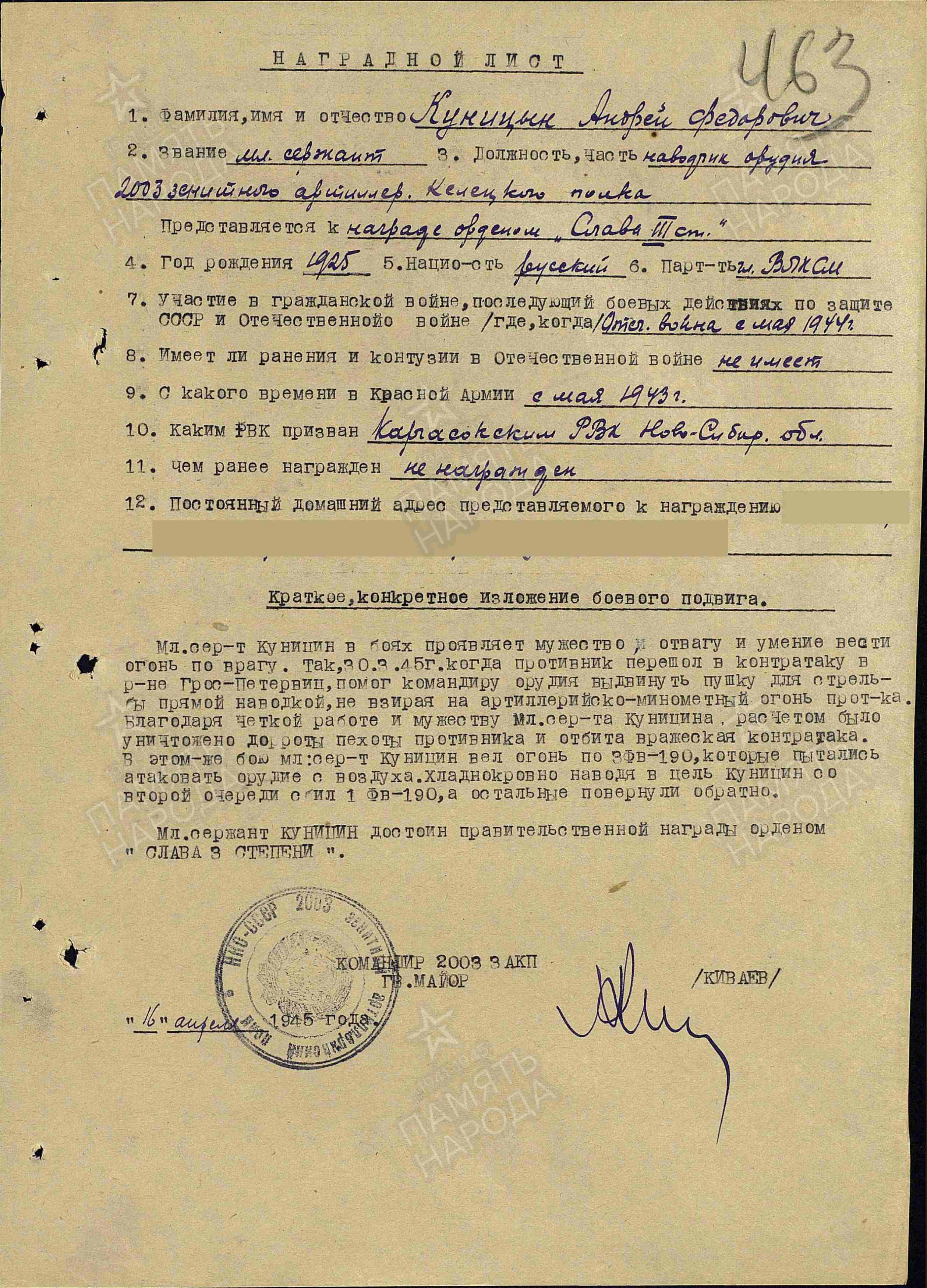 Представление к награде А.Ф. Куницина. Источник: портал «Память народа»