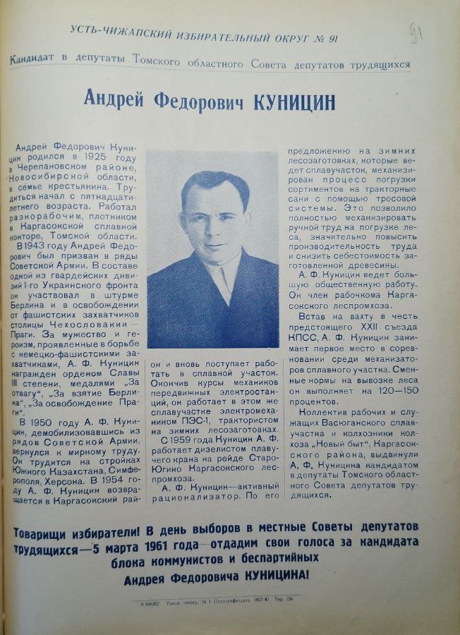Еще одним представителем лесопромышленного комплекса региона в составе Томского областного Совета стал в 1961 году Андрей Федорович Куницин, крановщик Васюганского сплавучастка Каргасокского леспромхоза.