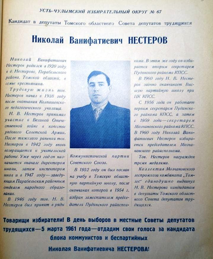 Н.В. Нестеров, кандидат в депутаты Томского областного Совета, 1961. Источник: Государственый архив Томской области
