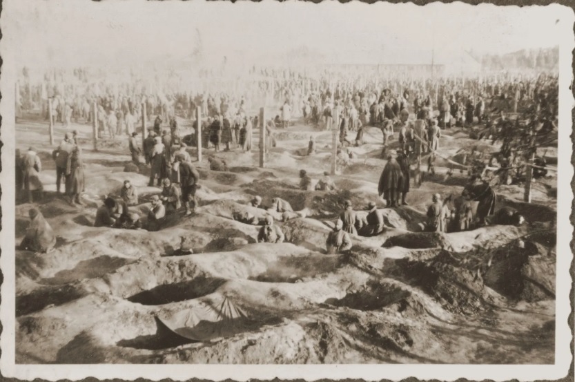 Остальным приходилось выкапывать на территории ямы в земле на 2−3 человека, чтобы можно было сидеть в них, прижавшись друг к другу, и накрывались шинелями или пальто (у кого было).