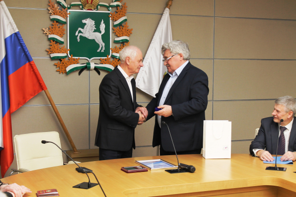 Председатель комитета по труду и социальной политике Законодательной Думы Томской области Леонид Глок от имени депутатского корпуса поздравил Александра Альбаха с 70 -летним юбилеем и вручил награды областного парламента.