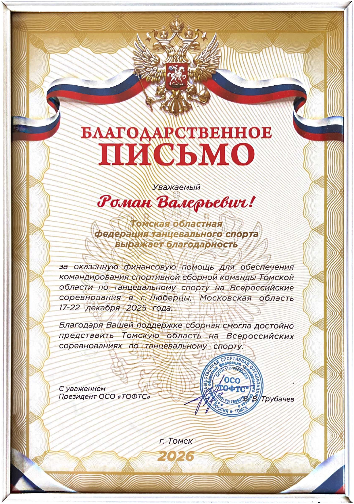 1) 06.12.2025 года принял участие в церемонии награждения участников региональных соревнований по танцевальному спорту "Кубок талисман" и официальных соревнований Томской области в группе мальчики и девочки 7-9 лет.