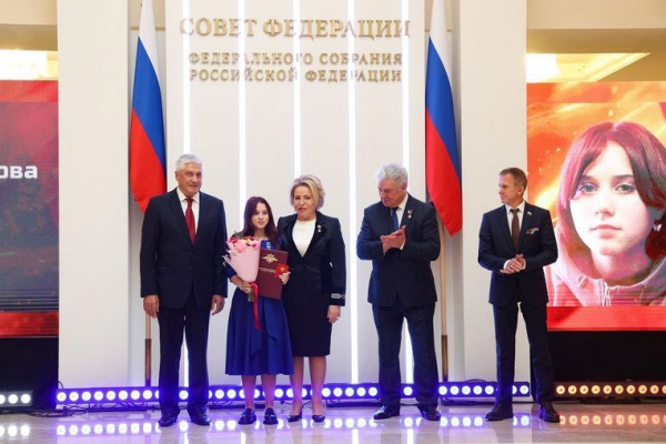 14-летняя жительница Первомайского района Виктория Гребенькова удостоена памятной медалью Совета Федерации «За проявленное мужество». Томская школьница весной спасла своих младших сестер и братьев из горящего дома. На торжественной церемонии чествования юных героев в верхней палате российского парламента председатель Совета Федерации Валентина Матвиенко и сенатор от Томской области Владимир Кравченко вручили ей заслуженную награду.