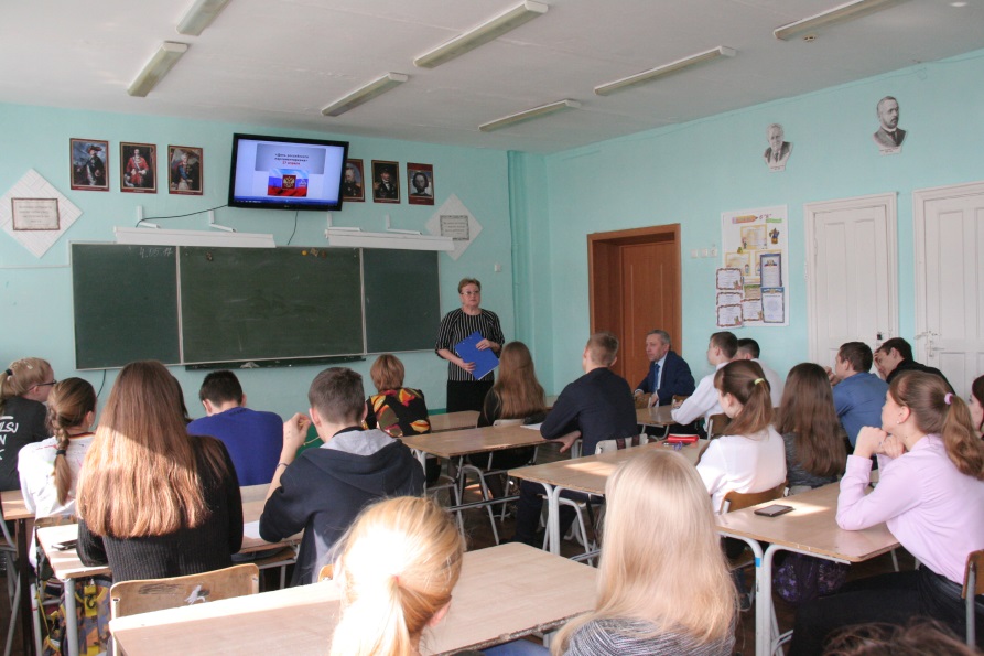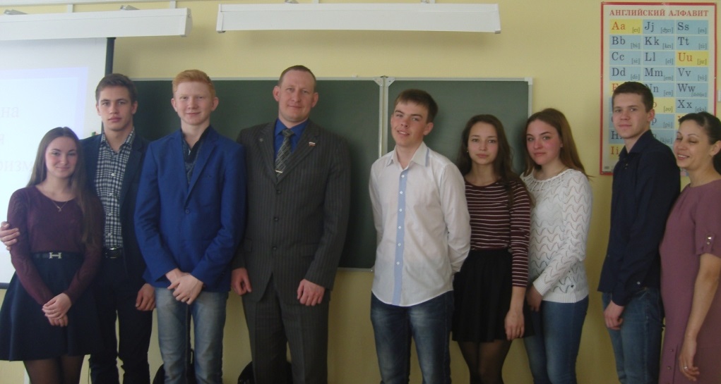 В гостях у учащихся 9-11 классов Заводской средней школы побывал депутат Думы Парабельского района Макшин В.Ф. Он побеседовал с ребятами о значимости этого дня в жизни народа. Депутат ответил на вопросы ребят и сфотографировался с ними на память.